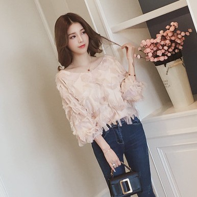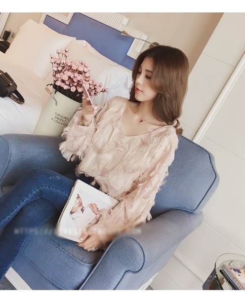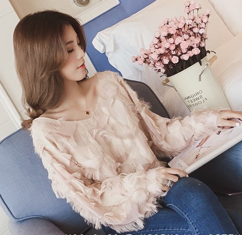 甜美氣質羽毛V領長袖上衣