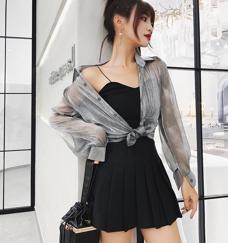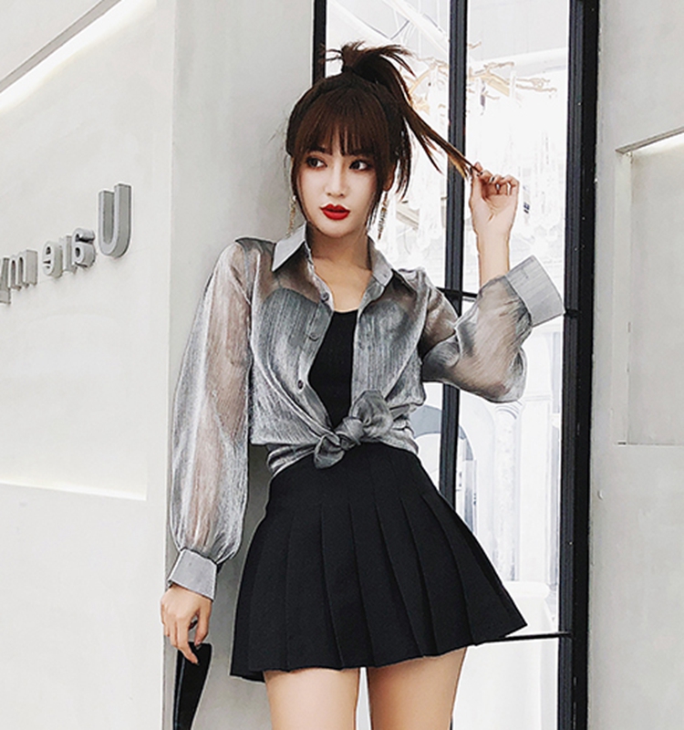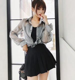 韓版小性感綁腰銀絲襯衫短裙三件套裝