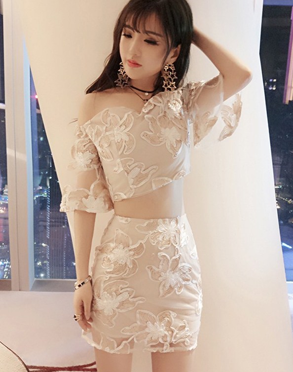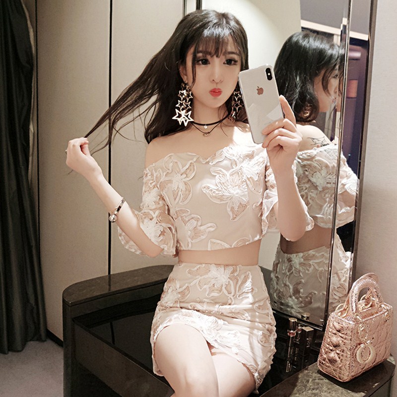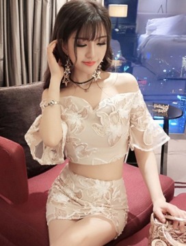 韓版性感一字領蕾絲露腰包臀兩件套裝