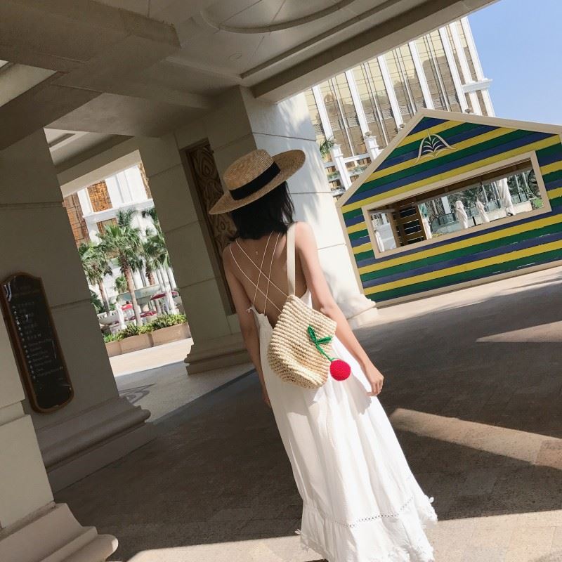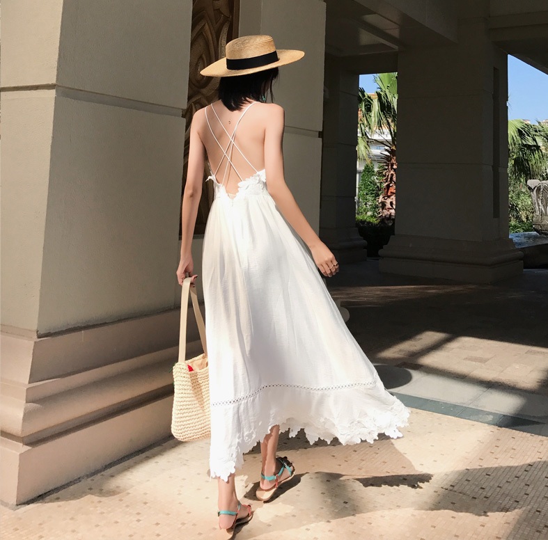 度假休閒純白露背長裙