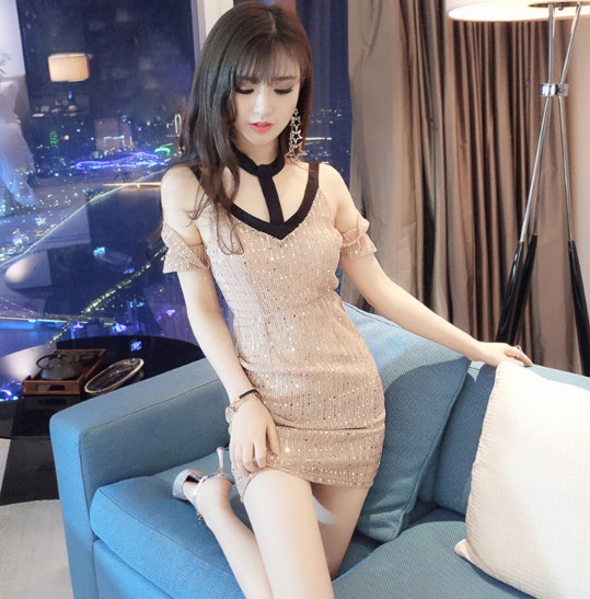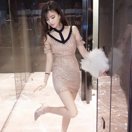 韓版性感簍空亮片短袖包臀連身裙
