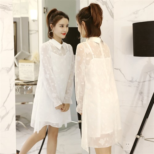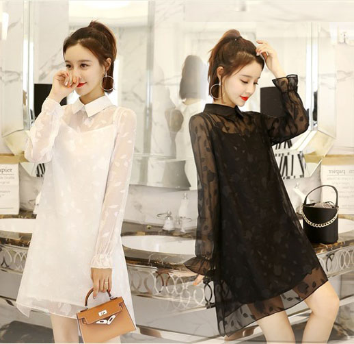 韓版甜美葉片網紗兩件套連身裙(2色)