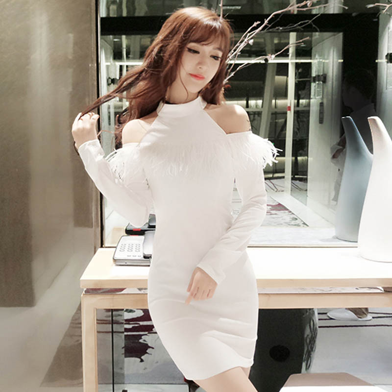 韓版性感削肩毛毛長袖包臀連身裙