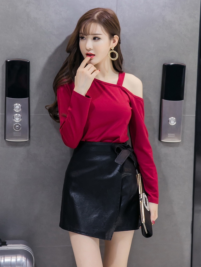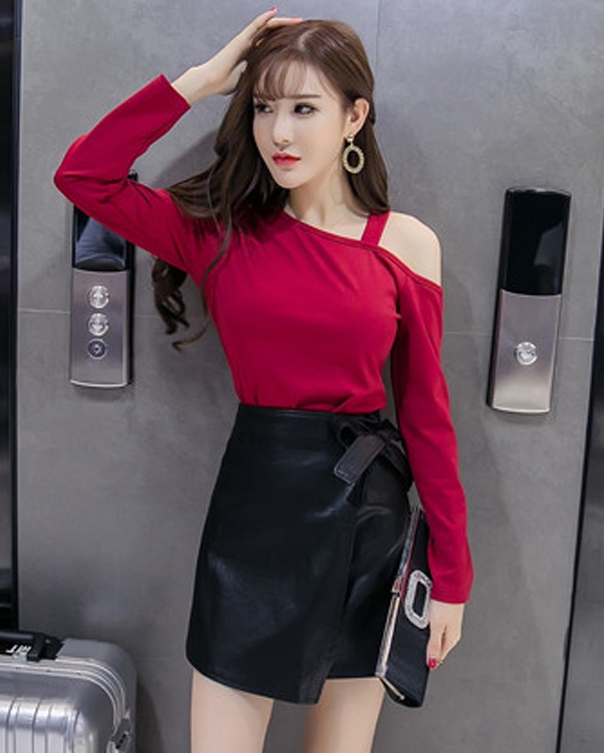 性感長袖露肩皮裙修身兩件套裝