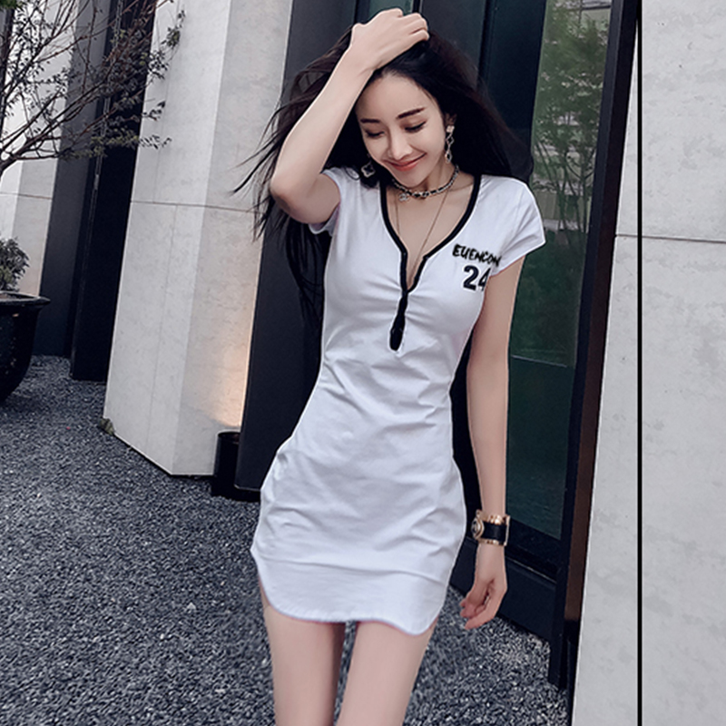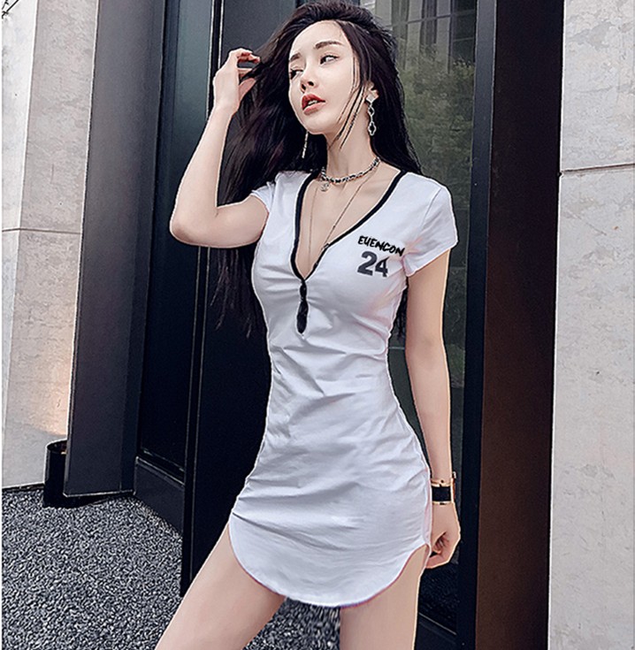 性感V領低胸圓弧下擺包臀長版上衣(2色)